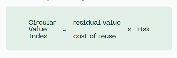 The Circular Value Institute defined a formula to check whether it’s worth reusing the products. You divide the residual value by the cost of reuse and multiply it with risk.