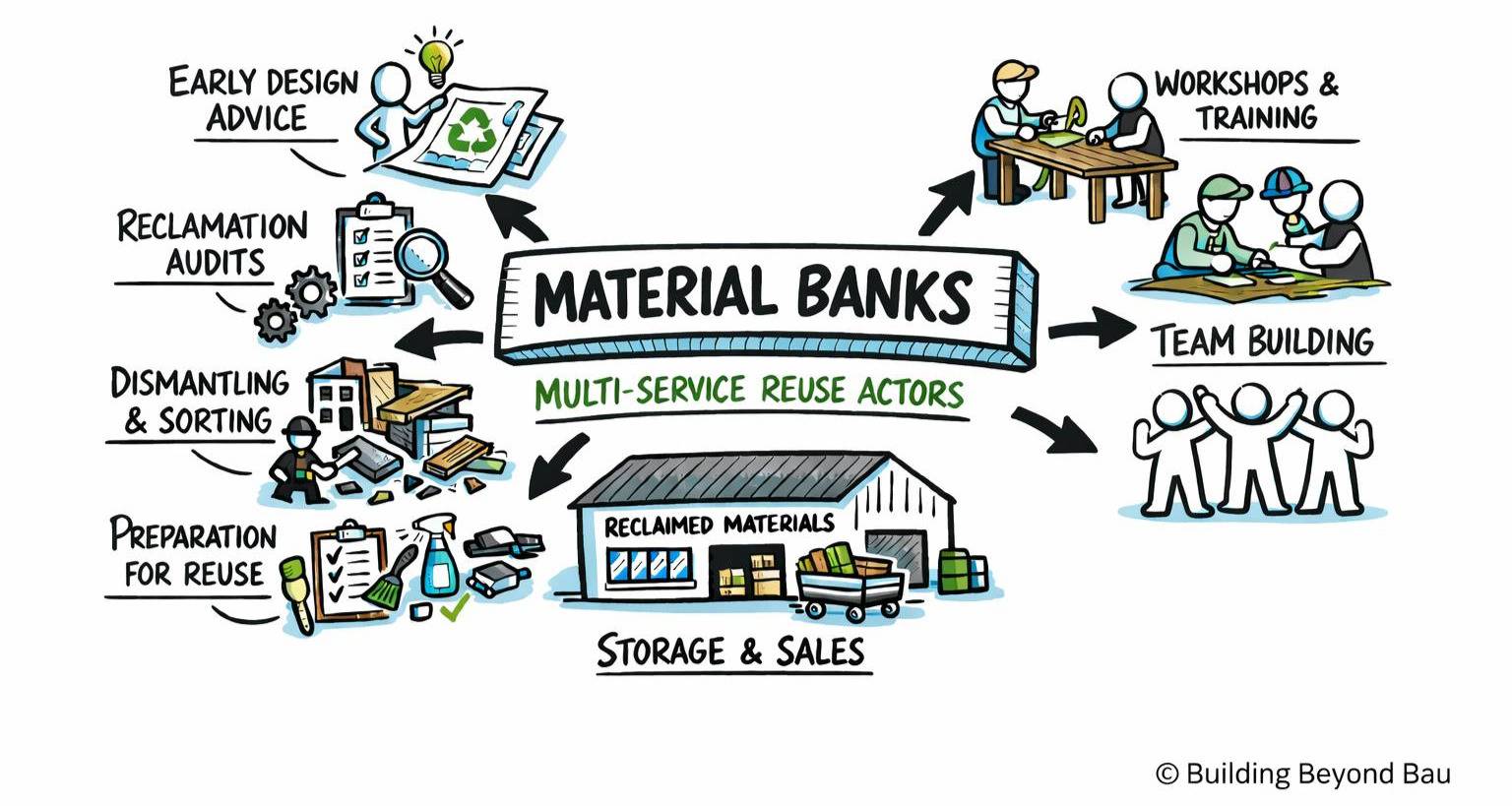 In this newsletter, a material bank — sometimes also called reuse center — is a very concrete thing: